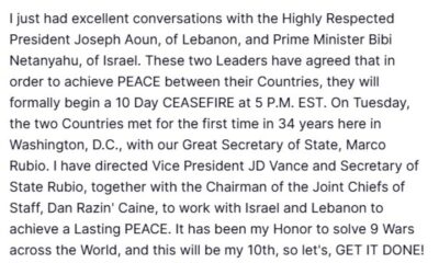 Ο ισραηλινός πρωθυπουργός, Μπενιαμίν Νετανιάχου, και ο λιβανέζος πρόεδρος, Ζοζέφ Αούν, θα επισκεφθούν τον Λευκό Οίκο για τριμερή συνάντηση με τον Ντόναλντ Τραμπ «εντός των επομένων...